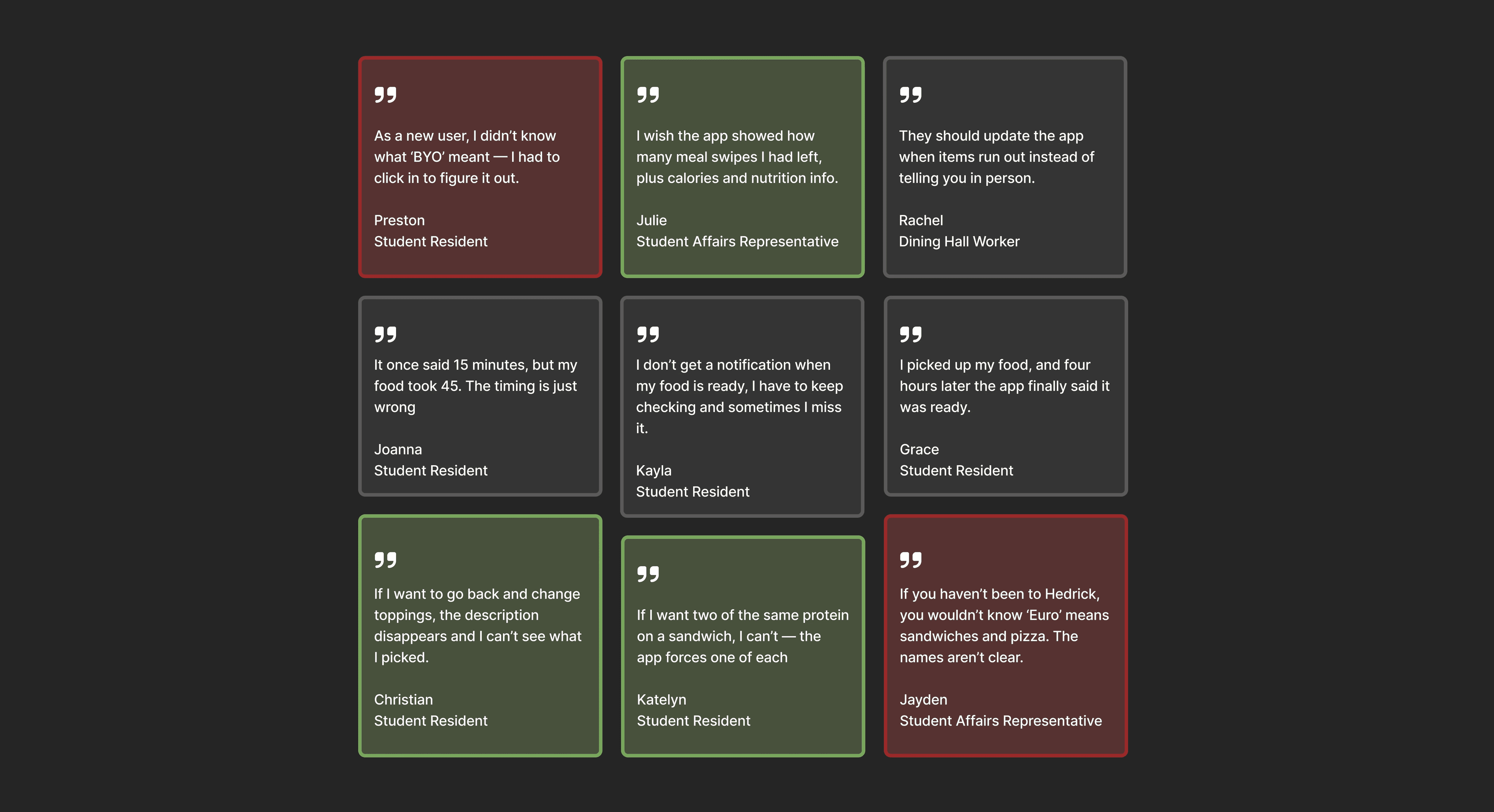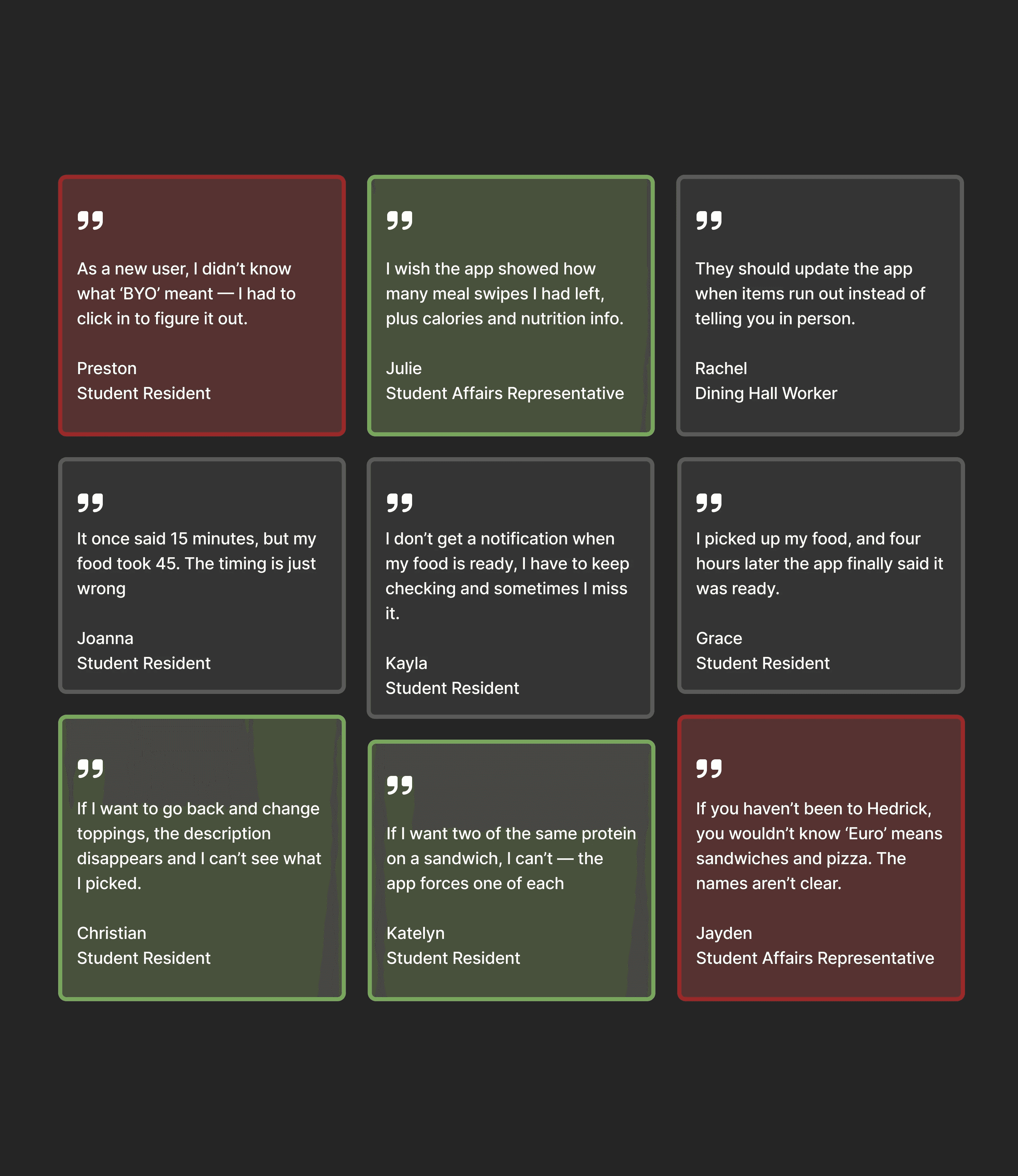In our early explorations, we interviewed 9 students, dining hall workers, and those who worked with student affairs to define the scope of our target improvements. Much of the feedback was systematic problems out of reach, whether that be in backend programming or back in the kitchen. Therefore, we identified 3 main areas of frustration that could be relieved through design adjustments.